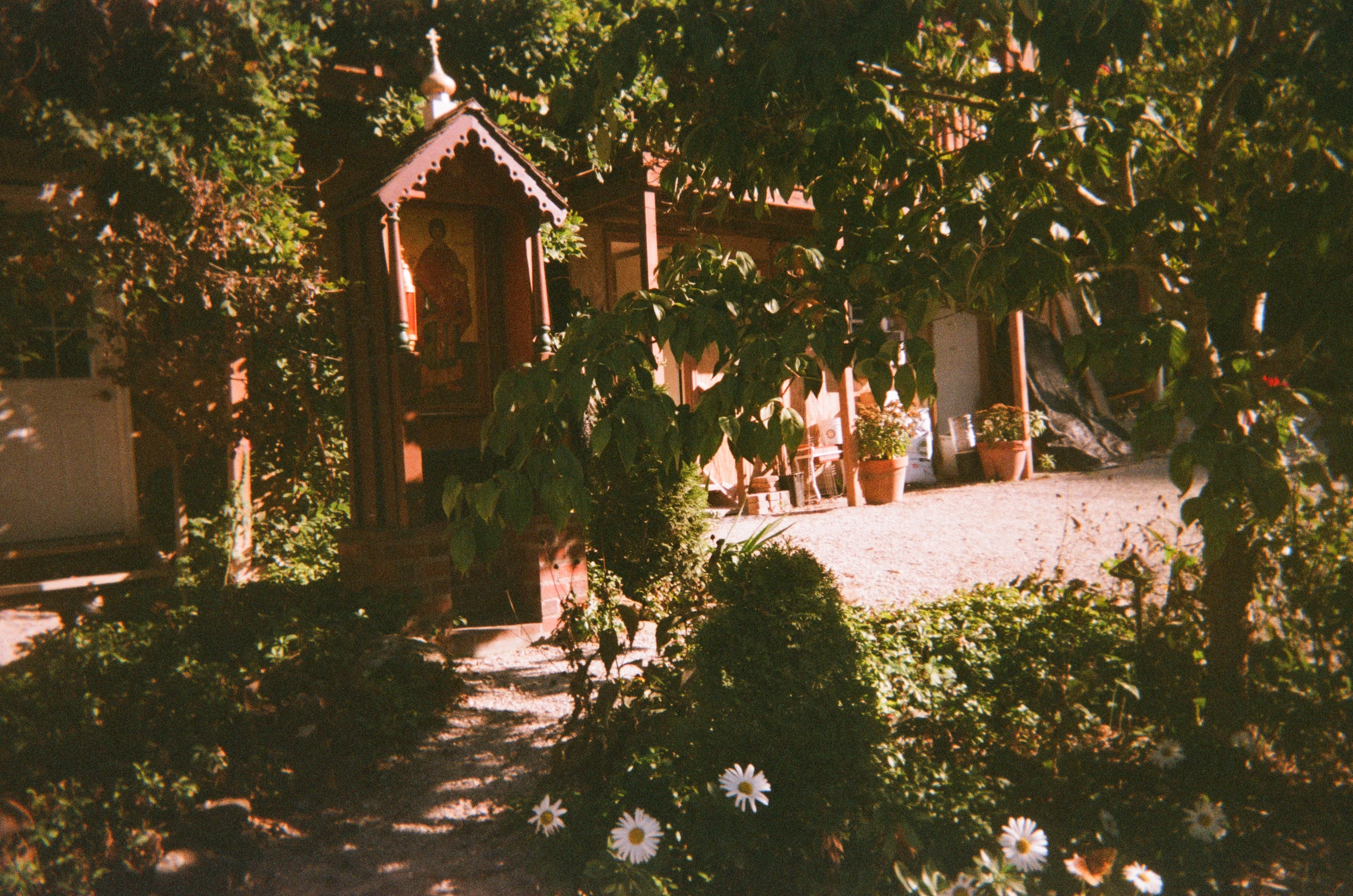 An icon of Saint Panteleimon (an important saint for the monastery) surrounded by plants